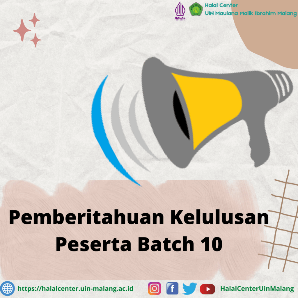[pdf-embedder url=”https://halalcenter.uin-malang.ac.id/wp-content/uploads/2022/09/Surat-ketetapan-Kelulusan-Peserta-Pelatihan-batch-10.pdf” title=”Surat ketetapan Kelulusan Peserta Pelatihan batch 10″] Dengan hormat, Seiring telah terlaksananya Pelatihan Pendamping Proses Produk Halal (PPH) Batch 10 yang dilaksanakan pada tanggal 9- 11 September 2022, Halal Center UIN Maulana Malik Ibrahim Malang telah melakukan evaluasi terhadap peserta yang telah mengikuti proses pelatihan tersebut. Berdasarkan hasil