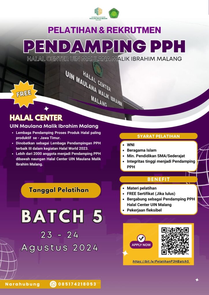 PELATIHAN P3H BATCH 5 Pendaftaran dan Rekrutmen P3H Batch 5 LP3H Halal Center UIN Maulana Malik Ibrahim Malang membuka Pelatihan Pendamping PPH Formulir pendaftaran melalui link https://bit.ly/PelatihanP3HBatch5 More Information ☎️ (Admin Halal Center) 085174218053